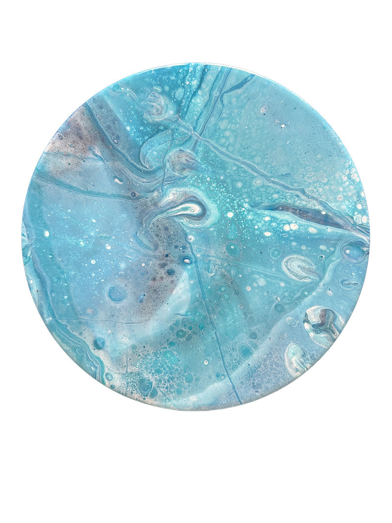 Experience the serene beauty of the cosmos reflected in "Celestial Waters," a one-of-a-kind mirror art piece that blends the calming hues of blue and teal with a touch of celestial mystery. This stunning artwork has been meticulously drip painted with the highest quality acrylic paints, creating fluid, swirling patterns reminiscent of a starlit ocean or the depths of space.