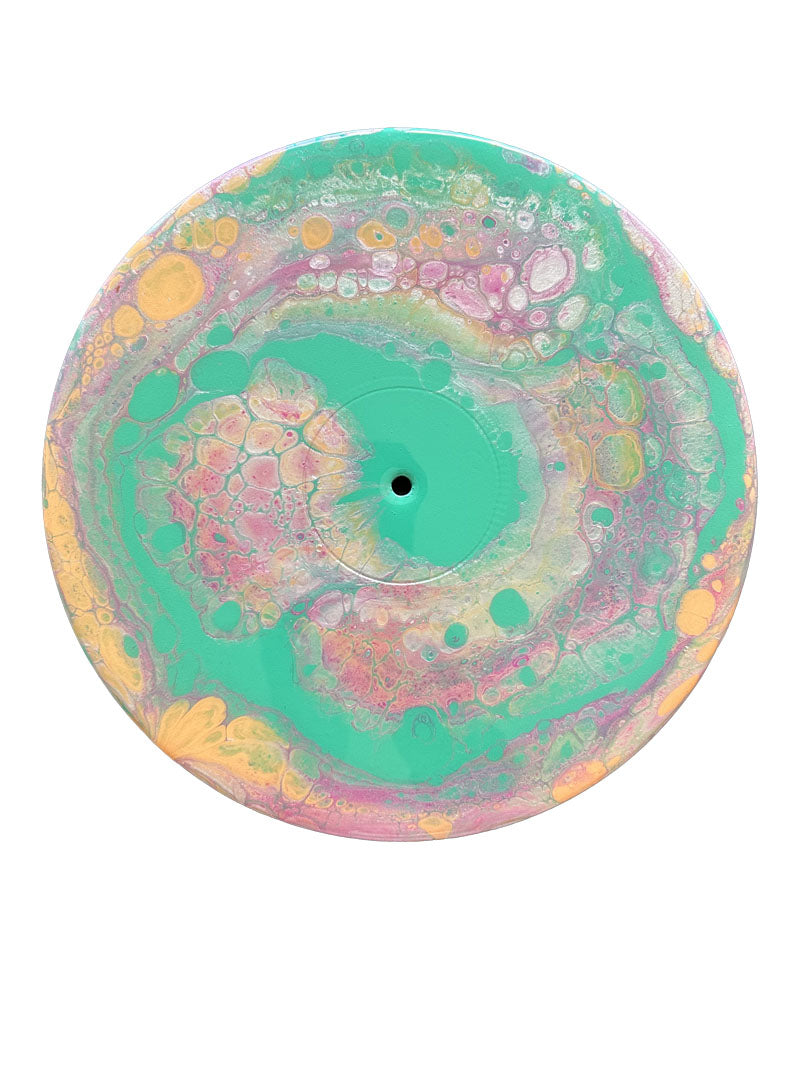 Indulge in a sweet escape with "Cotton Candy Dreams", an acrylic paint pour art piece, expertly crafted on a vinyl record. This delightful artwork features whimsical, wispy bubble clouds in playful shades of green, pink, and yellow, reminiscent of fluffy cotton candy swirling in the breeze. The soft, airy textures create a lighthearted visual experience that transports you to a carnival of color and imagination.